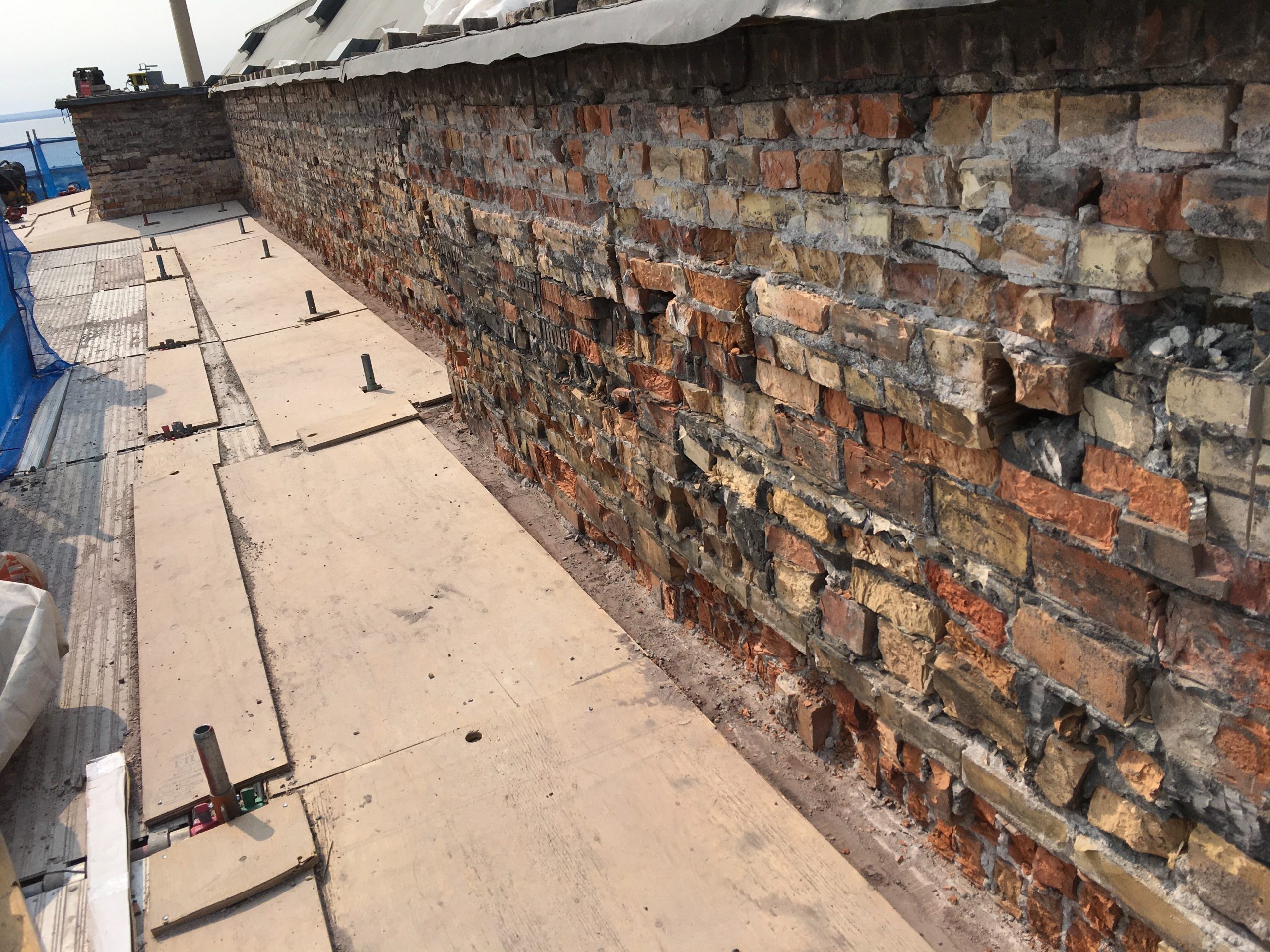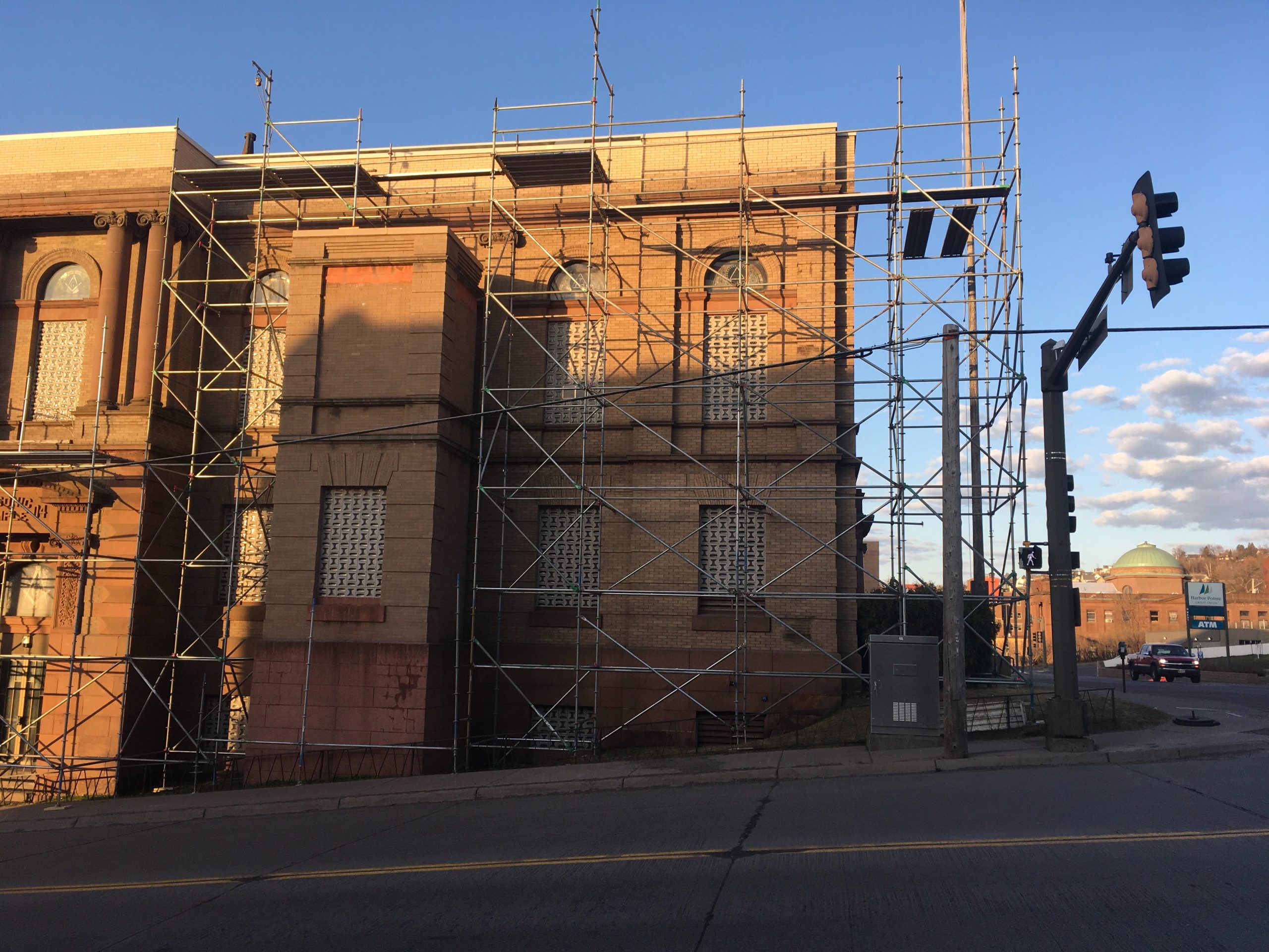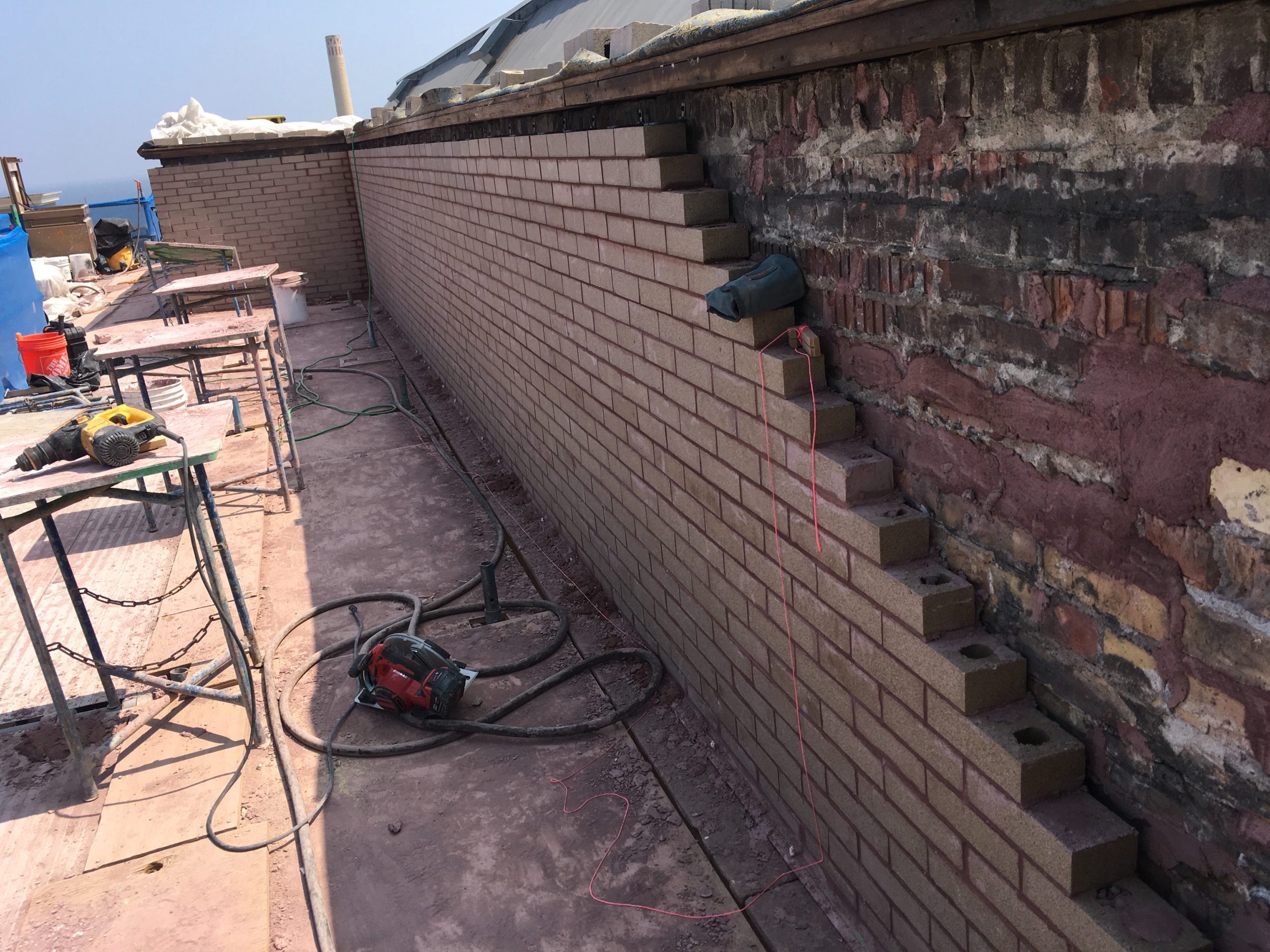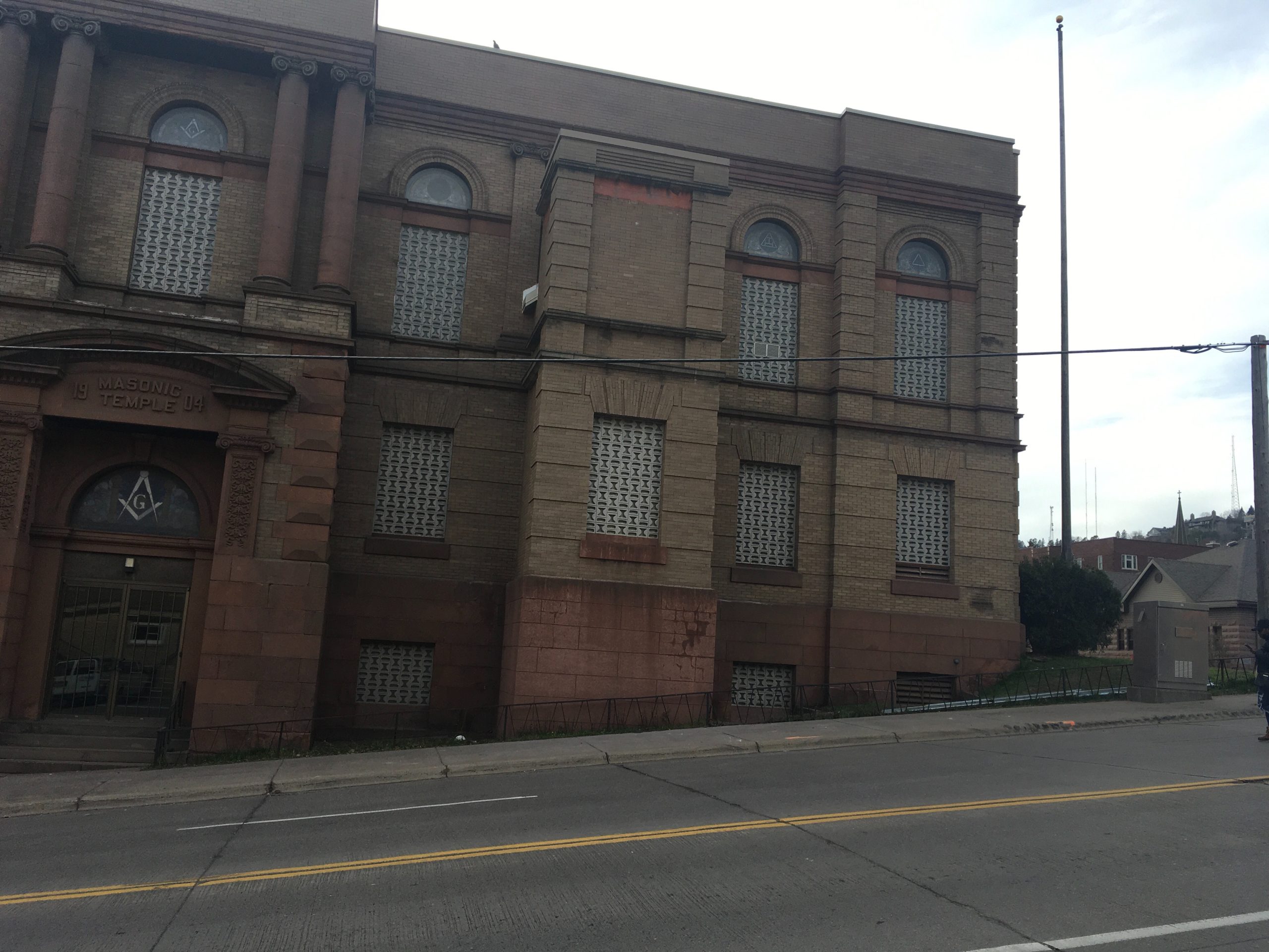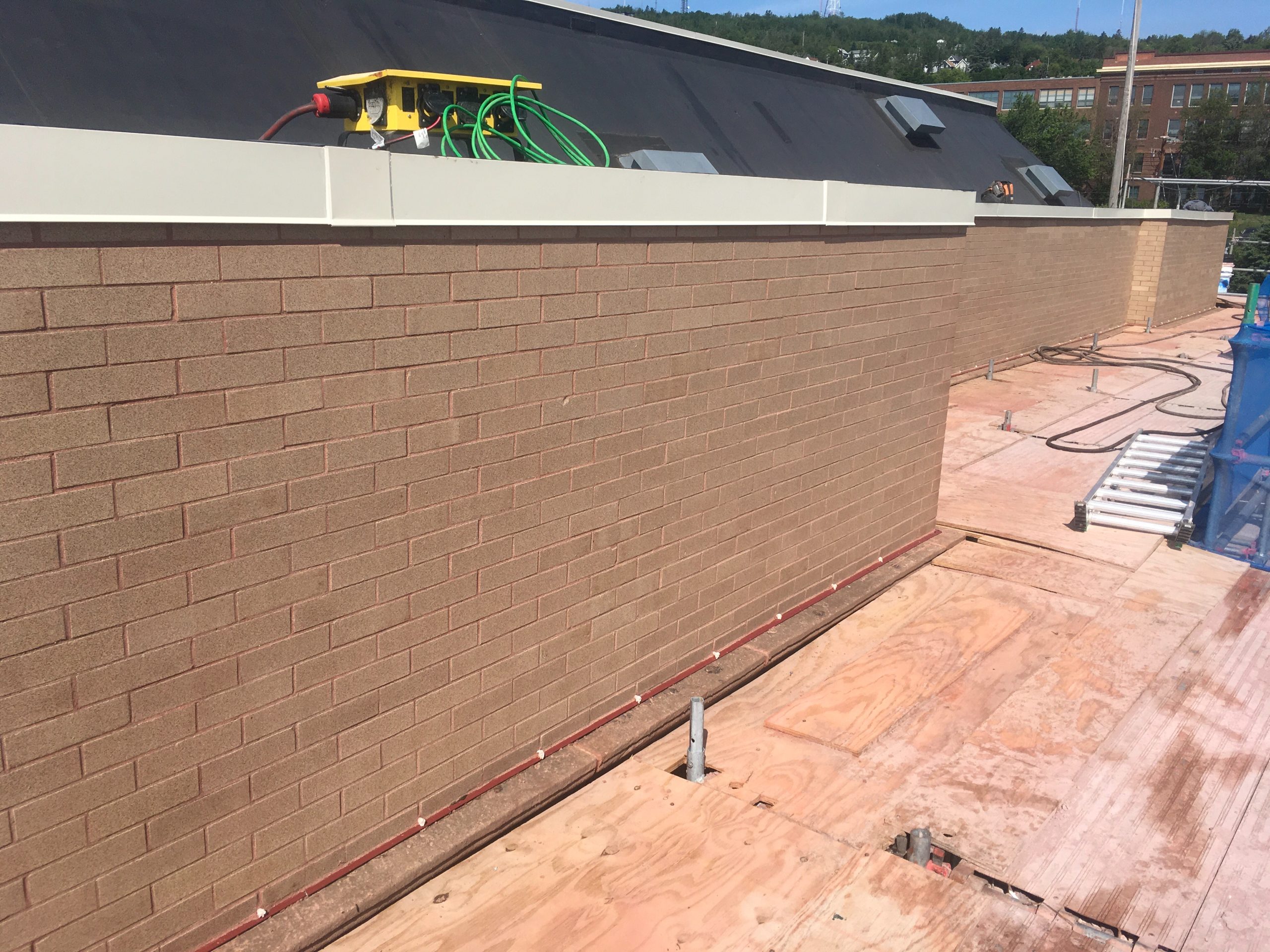 The Duluth Masonic Temple underwent a rebuild of its exterior wythe parapet. The repair consisted of demoing the exterior wythe brick that was deteriorating, parging of the backup wall for the lower 6-8 courses of brick, installing a peel-and-stick membrane for the lower 6 courses of brick, relaying of new exterior wythe brick, and caulking the skyward facing joints on the elevation.